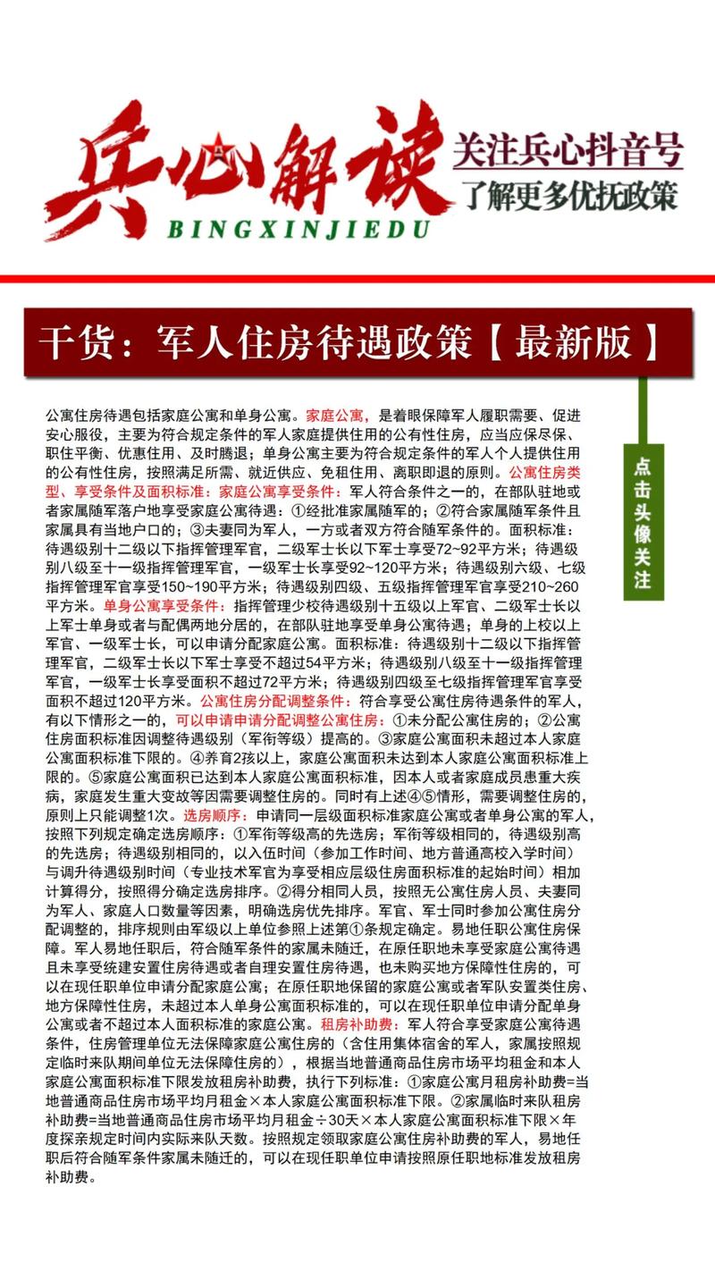 随着时代的进步和科技的发展,国家对于部队官兵的生活保障日益重视,最新实施的部队住房保障政策,便是一项集智能化、信息化于一体的现代化居住空间的重要举措,这一政策为全体官兵带来了更加智能化、人性化的居住环境,让军人们的日常生活更加安心、舒心。