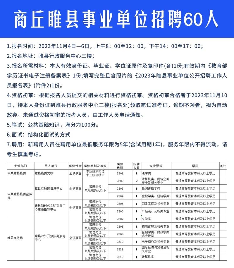 58商丘招聘最新消息不仅为求职者提供了广阔的选择空间,也为企业带来了优秀的人才资源,在这个充满机遇和挑战的时代,让我们共同把握机会,创造美好的未来,无论您是正在寻找工作的求职者,还是希望招聘优秀人才的企业,都可以在这里找到属于自己的舞台,希望通过这篇文章,能为您提供有价值的信息和建议,在商丘这片热土上,让我们一起为梦想努力!也提醒广大求职者,在求职过程中要注意保护个人信息,警惕虚假招聘信息,确保自己的合法权益。