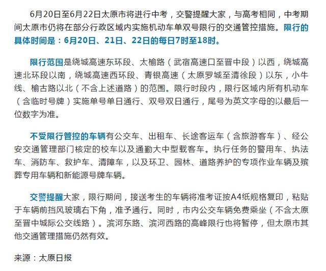 太原最新限号通知(6月版)——驾驶者必备指南。太原市将于本月实施新的车辆限行措施,具体限号规则及时效已公布。此次限号措施的实施旨在缓解城市交通压力,改善空气质量。受影响的驾驶者需密切关注限号通知,遵守限行规定,以免受到处罚。太原市6月份实施新的限号措施,驾驶者需关注最新通知并遵守限行规定。