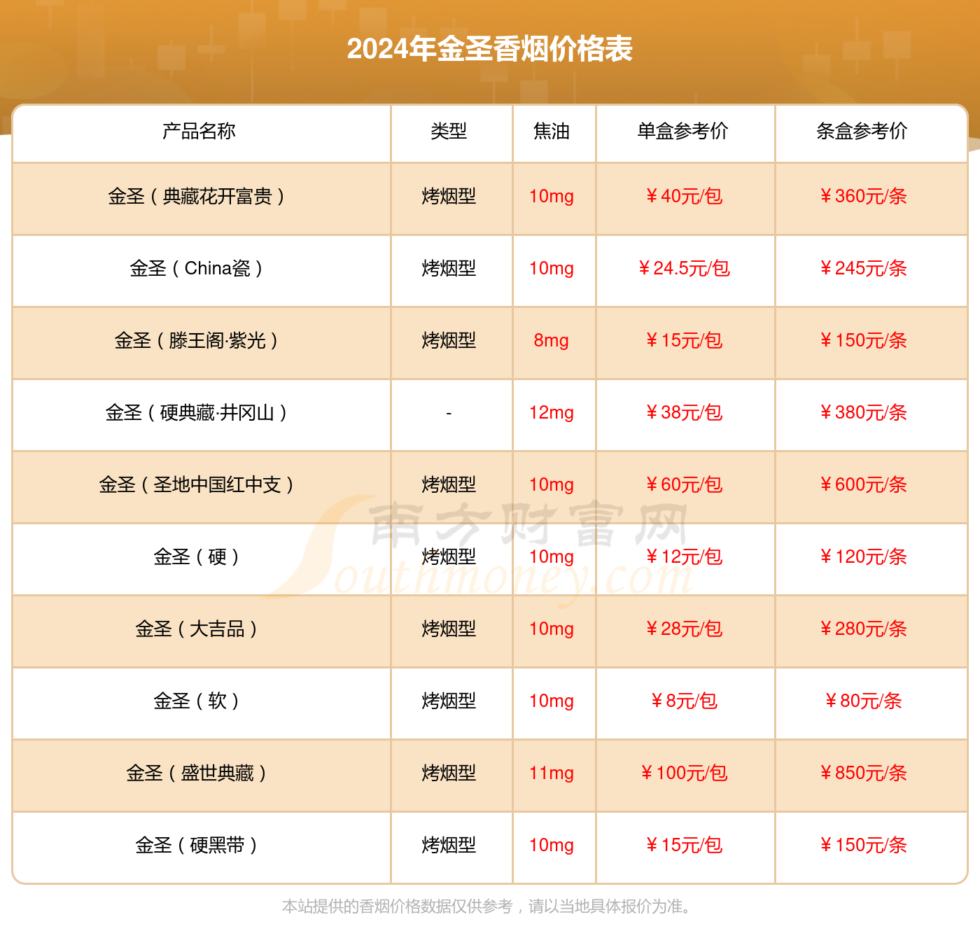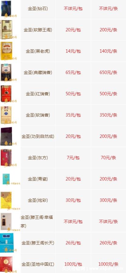 以下是金圣细烟主要产品的价格表(以人民币计价):